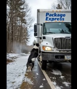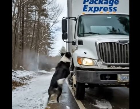 On a snowy mountain road, a Border Collie suddenly runs into the path of a moving truck — barking, blocking, refusing to move.