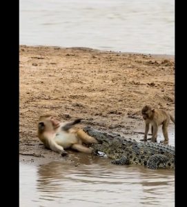 At the muddy edge of a slow-moving river, a terrifying scene unfolded—one that left no room for hesitation. A mother monkey lay trapped near the water, her leg locked tightly in the powerful jaws of a crocodile. Each movement only tightened the grip. Escape seemed impossible.