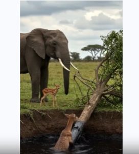 Step by step, the mother deer began to climb, guided by her tiny brave fawn who called to her with every cry. The elephant stayed by the tree, stabilizing it with his massive foot so it wouldn’t slip. Inch by inch, the mother deer reached solid ground.