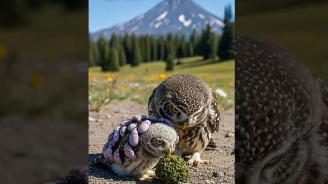 Finally, she reached the nest. Two other chicks peered out, their wide yellow eyes fixed on her. She gently placed the rescued baby beside its siblings, and almost instantly, the mother owl swooped in, her wings spreading wide in silent approval.