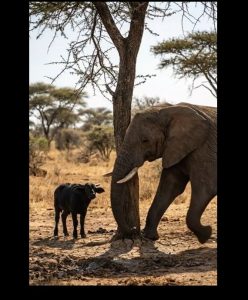 When the elephant saw the trapped mother buffalo, he acted immediately. Wrapping his powerful trunk around a nearby tree, he pulled with incredible force. The ground trembled as the roots snapped free, and the tree fell across the mud pit, creating a solid ramp.
