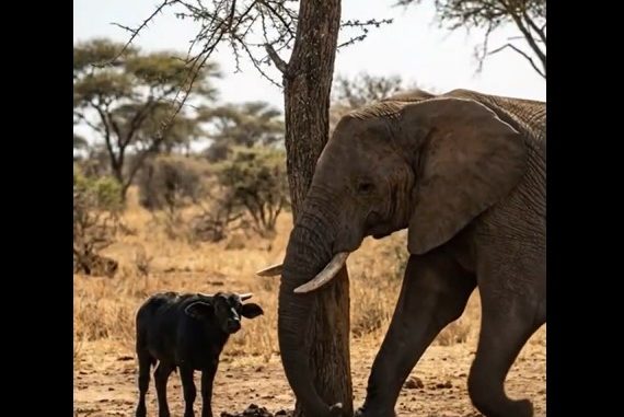 When the elephant saw the trapped mother buffalo, he acted immediately. Wrapping his powerful trunk around a nearby tree, he pulled with incredible force. The ground trembled as the roots snapped free, and the tree fell across the mud pit, creating a solid ramp.