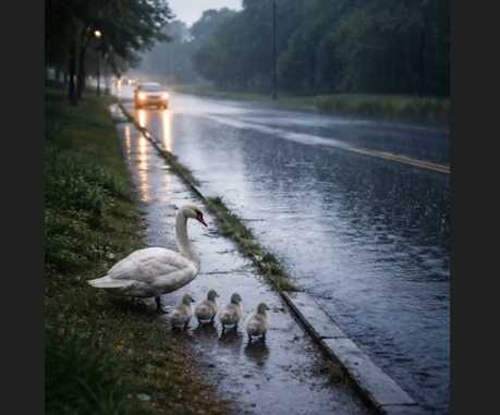 A quiet suburban road curved gently beside a small lake. The air was calm, and a light rain began to fall — the kind that feels harmless at first. Along the grassy edge of the road, a mother swan walked carefully with her tiny cygnets following in a neat, fragile line.