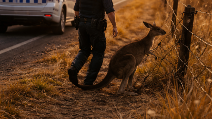 The kangaroo was frightened, its body tense, muscles trembling against the restraint. The officer removed his jacket carefully, speaking softly as if tone alone could lower the animal’s fear.