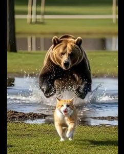 A young bear spotted the kitten and began running toward it — not understanding its own strength nor the fear it caused.