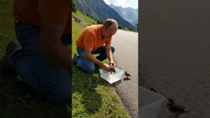 Driving along a scenic mountain road, a man with a generous spirit noticed something small and fluttering near the asphalt. His keen eyes quickly recognized a sparrow, surrounded by several tiny chicks, all dangerously close to the path of oncoming traffic. The little family was in a precarious situation, unable to escape the immediate peril.
