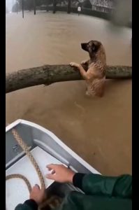 The footage opens with a large dog clinging desperately to a partially submerged log as fast-moving floodwaters rush around it. Clearly exhausted and terrified, the dog struggles to stay afloat. A rescuer slowly approaches, speaking calmly and extending gentle hands before carefully lifting the frightened animal into the safety of the boat.