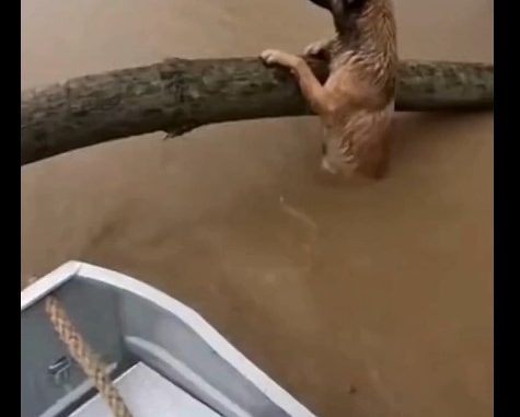 The footage opens with a large dog clinging desperately to a partially submerged log as fast-moving floodwaters rush around it. Clearly exhausted and terrified, the dog struggles to stay afloat. A rescuer slowly approaches, speaking calmly and extending gentle hands before carefully lifting the frightened animal into the safety of the boat.
