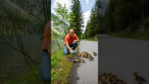 Along a peaceful road winding through a forest and beside a lake, a driver noticed a heartbreaking sight. A mother duck was lying motionless on the hot asphalt, with her tiny, fluffy ducklings huddled anxiously beside her. They were helpless and vulnerable, chirping in distress.