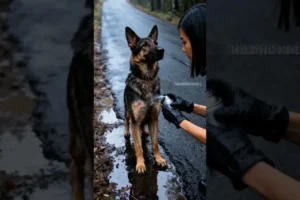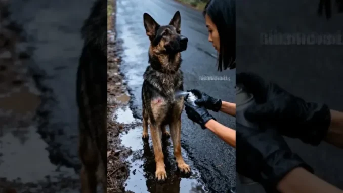 A compassionate woman discovers an injured German Shepherd on a desolate road and stops to provide immediate medical attention.