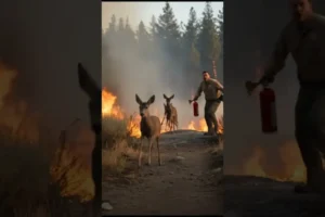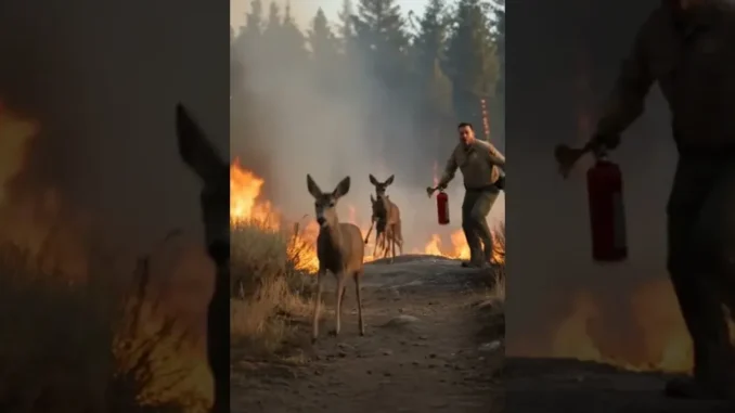 As smoke choked the air and flames painted the horizon, a family of deer found themselves completely surrounded. A mother and her two small fawns were trapped by a wall of fire, with every escape route rapidly vanishing. You can see the fear in their movements, their eyes wide with terror as the inferno closed in.