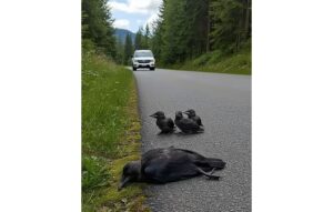 The crow had clearly been struggling for hours. She must have led her chicks out of the nest in search of food or shade, only to find herself trapped by exhaustion. With cars rushing past, she was too weak to fly, and her chicks were far too small to survive on their own.