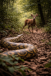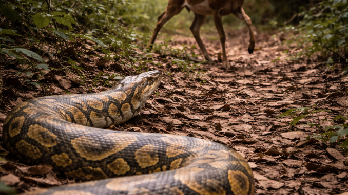 A massive python lay stretched across a narrow path, its body coiled and powerful. Just meters away, a deer stood frozen, eyes wide, breath shallow.
