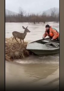 The man holding the blanket inched forward. He kept his voice low, soothing, as if trying to calm a child in the middle of a storm. The deer’s eyes flicked from him to the swirling water and back again, unsure which danger to fear more.