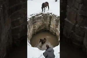Deep within the crevice, the foal is helpless, lost to the frigid darkness. Above, the mare’s cries are a powerful display of a mother’s instinct, a promise that she will not give up. Her gaze is fixed on the spot where he disappeared, her entire being focused on a single, impossible hope.