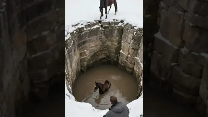 In the vast, silent cold of the arctic tundra, a mother horse’s frantic neighs shatter the peace. Her worst fear has become a reality; it’s a heart-stopping realization that her beloved foal has vanished into a deep, icy fissure in the earth.