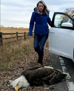 Sarah called animal rescue, but poor signal meant help would take at least 40 minutes. She couldn’t wait. Carefully, she covered the eagle with her jacket to calm it, whispering gently as it trembled under her touch. Using her car keys, she began cutting the tangled line — one slow, shaking motion at a time.