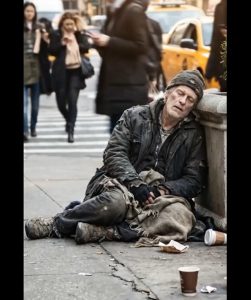 On a cold sidewalk near a busy street, a poor man lay motionless beside a large flower pot. His clothes were worn, his body still, and his eyes closed as if he had lost consciousness. People walked past him, some glancing briefly, others looking away, unsure or unwilling to stop.