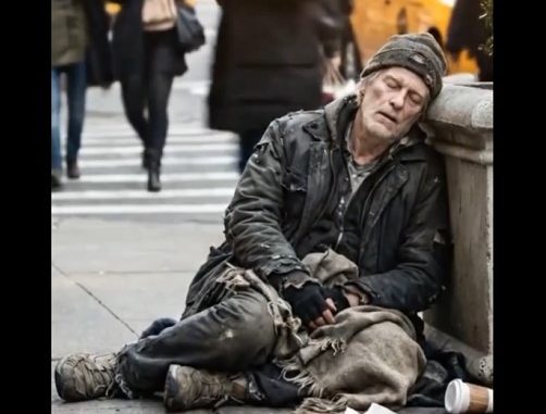 On a cold sidewalk near a busy street, a poor man lay motionless beside a large flower pot. His clothes were worn, his body still, and his eyes closed as if he had lost consciousness. People walked past him, some glancing briefly, others looking away, unsure or unwilling to stop.