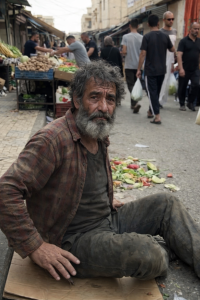 In the middle of a crowded outdoor market, life moves fast. People shop, talk, bargain, and pass by without slowing down. On the ground, near scattered vegetable scraps, a middle-aged man sits on flattened cardboard. He is tired. He is hungry. And for most people around him, he is invisible.