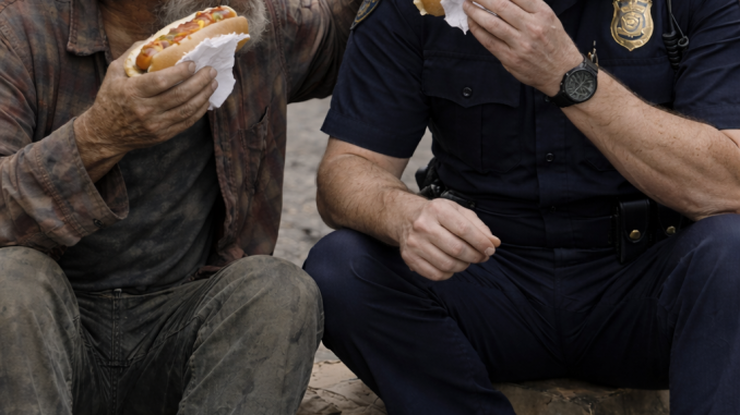 He bends slightly and offers him one of the hot dogs. The man looks up, surprised. Emotional. Unsure for a second. Then grateful. The officer doesn’t stand over him. He sits down next to him. On the same cardboard. At the same level.