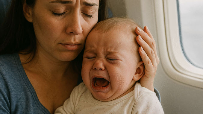 The baby’s cries pierced through the cramped airplane cabin, shrill and unrelenting. A few heads turned, others sighed loudly or shifted uncomfortably in their seats. The fluorescent cabin lights buzzed overhead, and the recycled air felt suffocating.