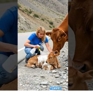 High in the mountains, where narrow roads twist dangerously along cliffs, a baby cow had strayed too far from its herd. Lost and scared, the young calf found itself stuck near the edge of the road, trembling and helpless. Passing cars slowed down, unsure of what to do, but afraid to approach the frightened animal. That’s when a kind woman decided to act.