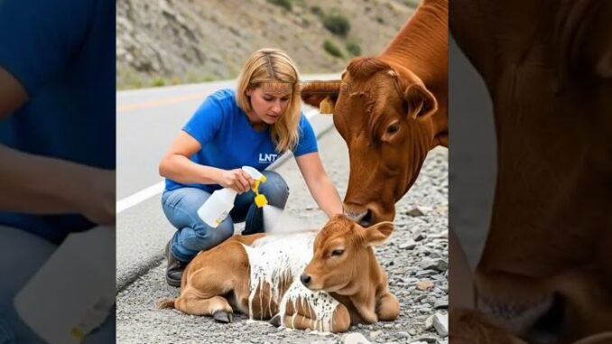 High in the mountains, where narrow roads twist dangerously along cliffs, a baby cow had strayed too far from its herd. Lost and scared, the young calf found itself stuck near the edge of the road, trembling and helpless. Passing cars slowed down, unsure of what to do, but afraid to approach the frightened animal. That’s when a kind woman decided to act.