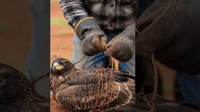 Following the sound, Daniel discovered a majestic eagle tangled in a section of old barbed wire fence. The bird’s wings were pinned, its feathers ruffled and damaged, and its eyes full of fear. Each attempt to free itself only made the wire cut deeper.