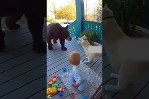 Suddenly, a large black bear calmly walked onto the deck, its quiet steps bringing it unnervingly close to the child. The sheer size of the animal was intimidating, and it seemed to be investigating the strange, small human on the ground. The peaceful afternoon was instantly transformed into a tense and dangerous standoff.