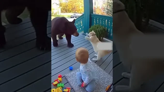 Just as the bear got within feet of the baby, the family’s small dog shot into frame like a lightning bolt. With unbelievable courage, the tiny canine planted itself firmly between the baby and the massive predator. It was a true David and Goliath moment, as the dog, a fraction of the bear’s size, refused to show any fear.