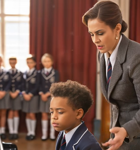 The classroom was silent except for the distant hum of chatter in the hallway. A row of students stood near the piano, their faces a mix of curiosity and quiet anticipation. In the center sat a young boy, his small hands resting gently on the keys. He wore his school uniform neatly, shoulders straight, but his eyes betrayed the weight he carried—a heaviness born not from the piano, but from being singled out.