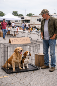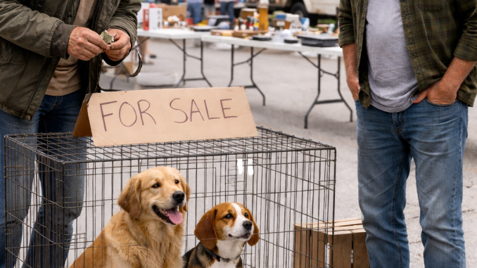 Voices echoed between rows of old clothes, tools, and forgotten things. In the middle of it all, two dogs sat quietly inside a metal cage. A small sign hung above them: