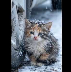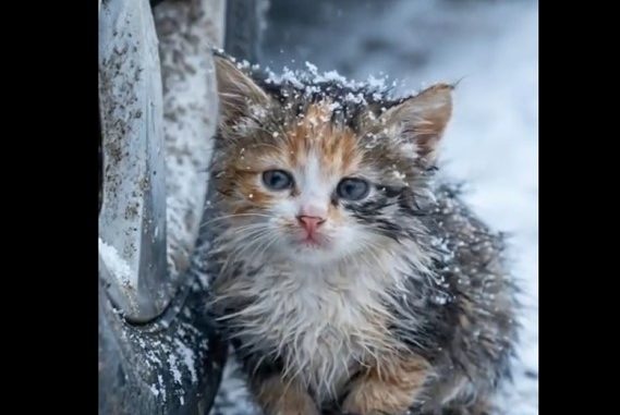 The winter air was sharp and unforgiving. Snow covered the ground, and the cold seemed to seep into everything it touched. Near the edge of a quiet street, an abandoned car sat still, forgotten by time. Beside it, barely visible against the icy pavement, was a tiny calico kitten.