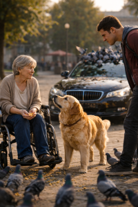 The square was calm. Pigeons gathered around an elderly woman sitting in a wheelchair, gently scattering cereal from her hands. She wasn’t asking for attention. She wasn’t disturbing anyone. It was simply a peaceful moment between a woman, a few birds, and her loyal dog resting nearby.