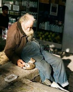 She was small, too small to be on her own. But she wasn’t afraid. She stretched lazily in the warm patch of sun, her little paws resting against his chest as he gently scratched behind her ear. Then, I noticed the plastic container beside him—half-filled with water. Crumbs scattered near his feet.