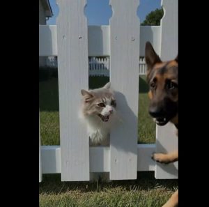 A German Shepherd suddenly stopped what he was doing. His ears lifted, his body tensed, and without hesitation, he ran toward the sound. When he reached the wooden fence, he saw the cat stuck between the bars, terrified and exhausted.