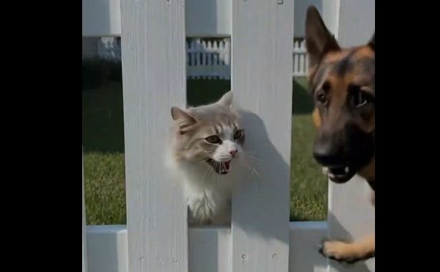 A German Shepherd suddenly stopped what he was doing. His ears lifted, his body tensed, and without hesitation, he ran toward the sound. When he reached the wooden fence, he saw the cat stuck between the bars, terrified and exhausted.
