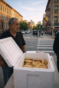 Gray hair. Weathered hands. A small folding table. A large white cooler filled with freshly baked empanadas.