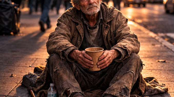 He held a small cardboard sign. His coat was worn but clean. His posture tired, but not broken.