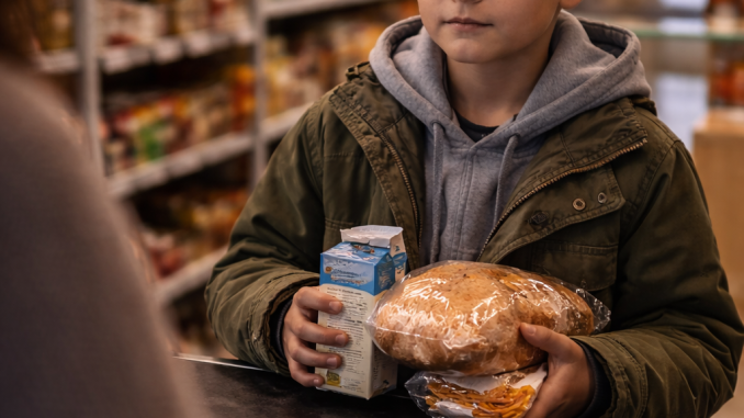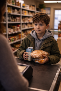 He held a loaf of bread, a small carton of milk, and a pack of instant noodles. His clothes were slightly worn, but clean. His hands gripped the items carefully, like they mattered more than they should.