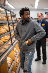 Under the bright lights of a supermarket aisle, shelves of fresh bread stood neatly stacked, warm and golden behind plastic wrapping. Between them, a man in a worn gray hoodie and ripped jeans moved carefully, his hands shaking slightly as he slipped a loaf into his pocket.