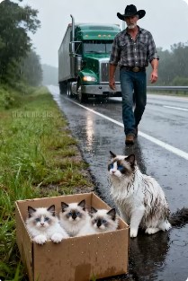 In an emotional and inspiring moment caught on camera, a truck driver became an unexpected hero after discovering an abandoned cat family on the side of the road. The mother cat and her tiny kittens were huddled together, frightened, hungry, and in desperate need of help.
