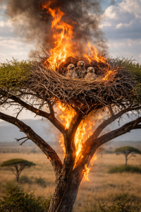 The mother bird circled through the thick air, her wings catching the light of the flames. Instead of flying away to safety, she turned back toward the burning tree.
