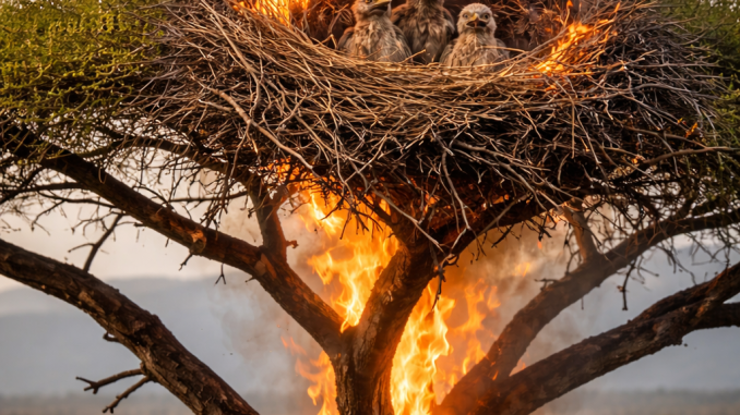 The mother bird circled through the thick air, her wings catching the light of the flames. Instead of flying away to safety, she turned back toward the burning tree.