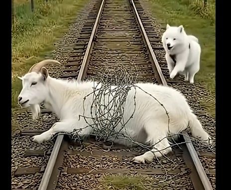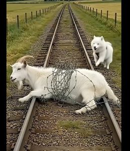 a goat trapped on the train tracks, tangled tightly in metal wire and unable to move.