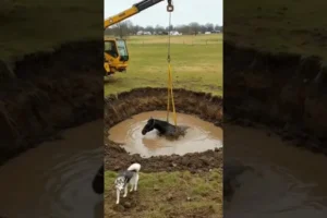 Thanks to the dog’s persistent warning, help arrived. Rescuers brought in a crane, understanding that a delicate operation was needed. They carefully secured straps around the horse’s body, and the machine began its slow, steady work. As the horse was gently lifted from the muddy trap and placed back on solid ground, everyone breathed a sigh of relief, profoundly grateful for the heroic dog that saved the day.