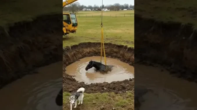 Nearby, a loyal husky sensed that something was terribly wrong. Upon discovering its equine friend trapped and distressed, the dog immediately sprang into action. Its barks were not playful; they were a desperate cry for help. The husky refused to give up, running back and forth to get the attention of its human companions, insistently leading them toward the pit.