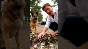 In a heartwarming act of kindness, a man and his loyal German Shepherd became unexpected heroes, saving a desperate mother duck and her tiny ducklings from a dangerous roadside situation.
