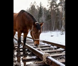 The scene opens on a desolate, snow-covered railway track surrounded by a quiet forest. A beautiful brown horse stands trapped and alone, its lead rope tied securely to the cold steel rail. Its whinnies echo through the trees, a chilling sound of fear as it pulls against its restraints, its breath pluming in the frigid air.